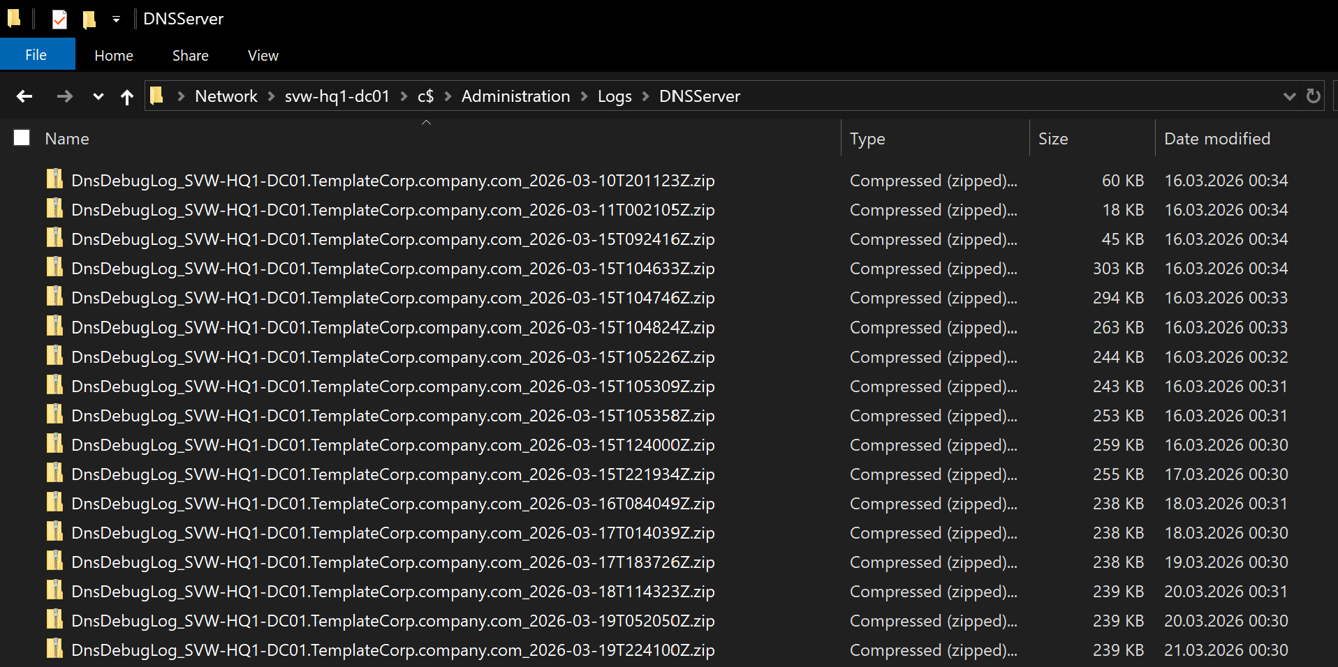Combining all of the above, you can have a pretty powerful and flexible tool to get data for further analysis from the DNS debug logs, while also taking care of storage space and file management. As a final example, I want to bring up a more complete example that you can use in a production environment: