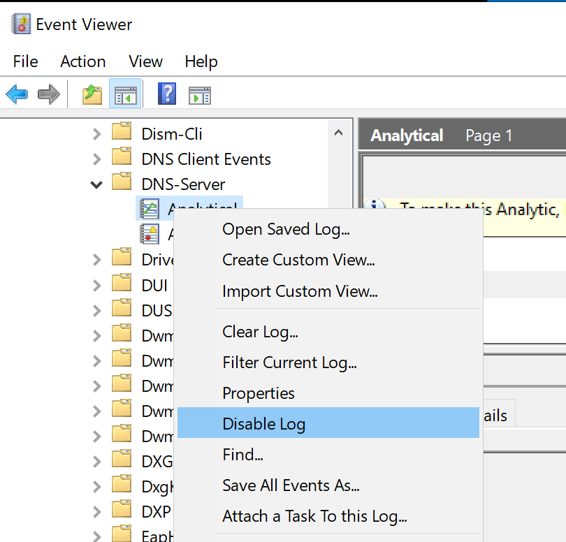wevtutil set-log "Microsoft-Windows-DNSServer/Analytical" /e:false