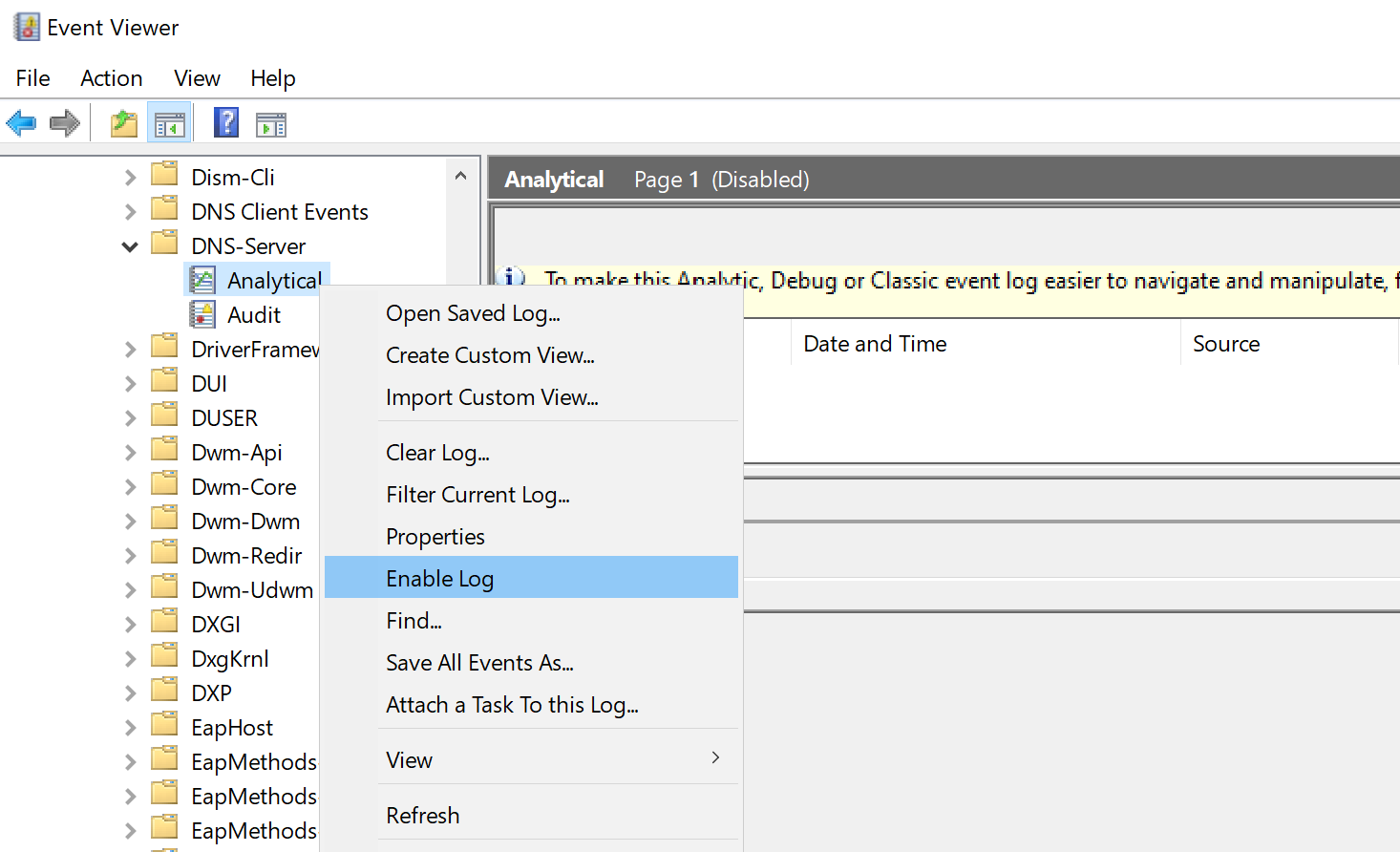 In there, you need to enable analytical and debug logs for the DNS Server.