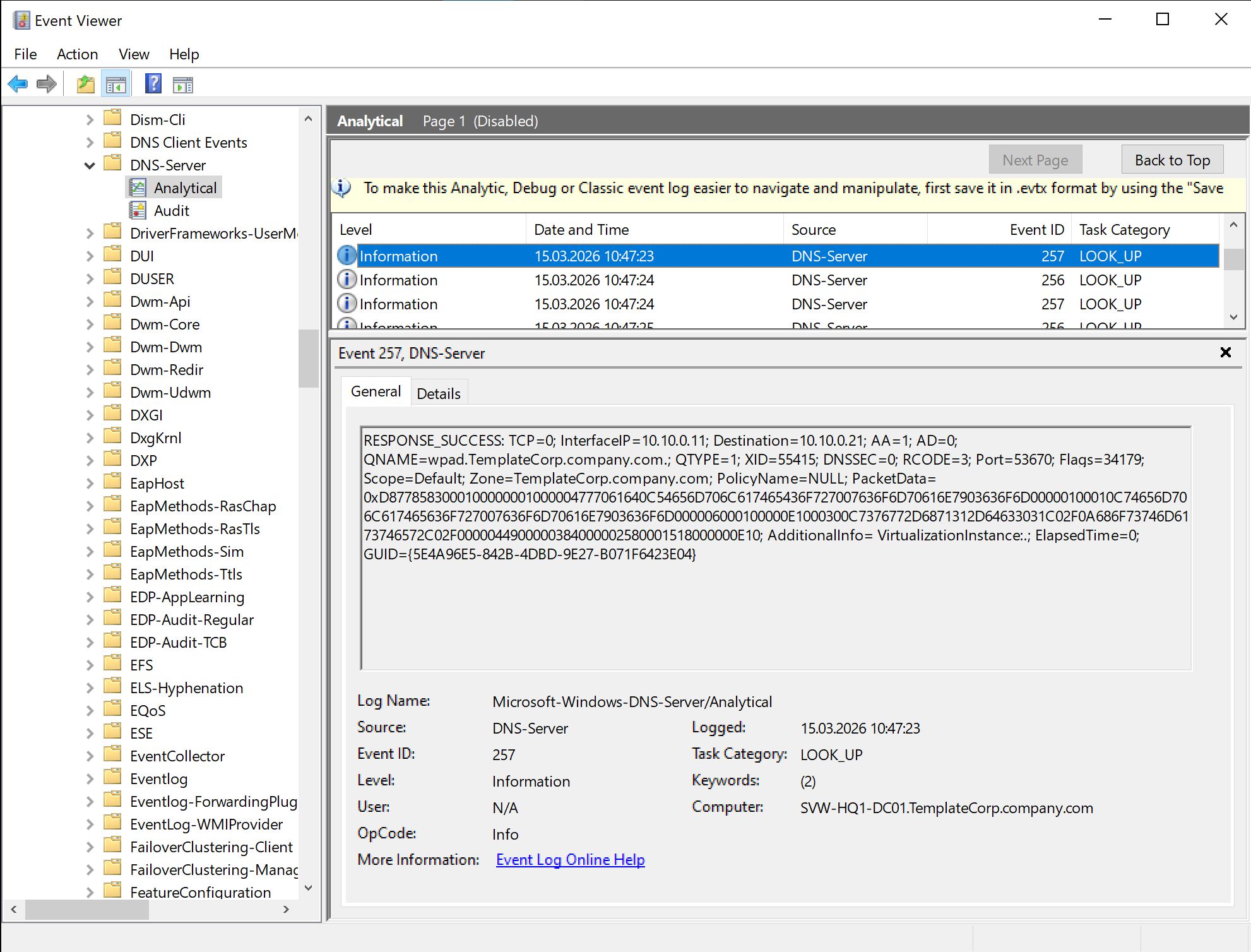 Effectively, there are two more DNS Server EventLogs available down in the folder structure. The Audit log that provides operational information what kind of operations are occurring in the DNS Server: