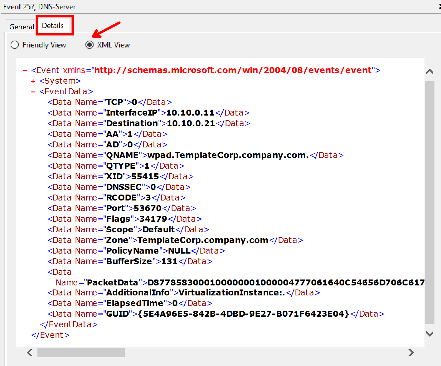 Because of the nature of EventLogs, there is also an XML data view available that provides a more structured view of the captured events. This means the EventLog records do not contain the text message from the screenshot above, but instead contain a raw data structure that is rendered as a text message in Windows Event Viewer.