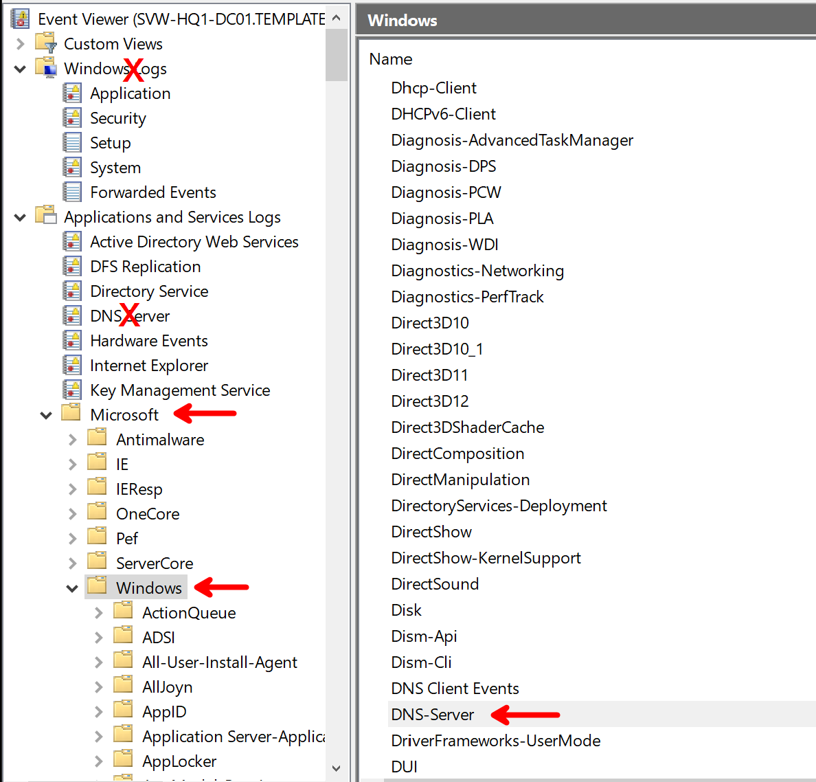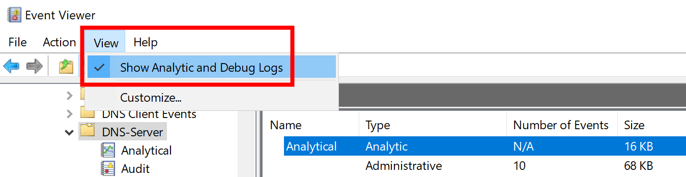 Apart from the classic Windows Event Logs, there are also some DNS Server specific application logs available. Many know the “DNS Server” log in the “Application and Services Logs” section of the Event Viewer, but they are not that interesting for real insights into the service.