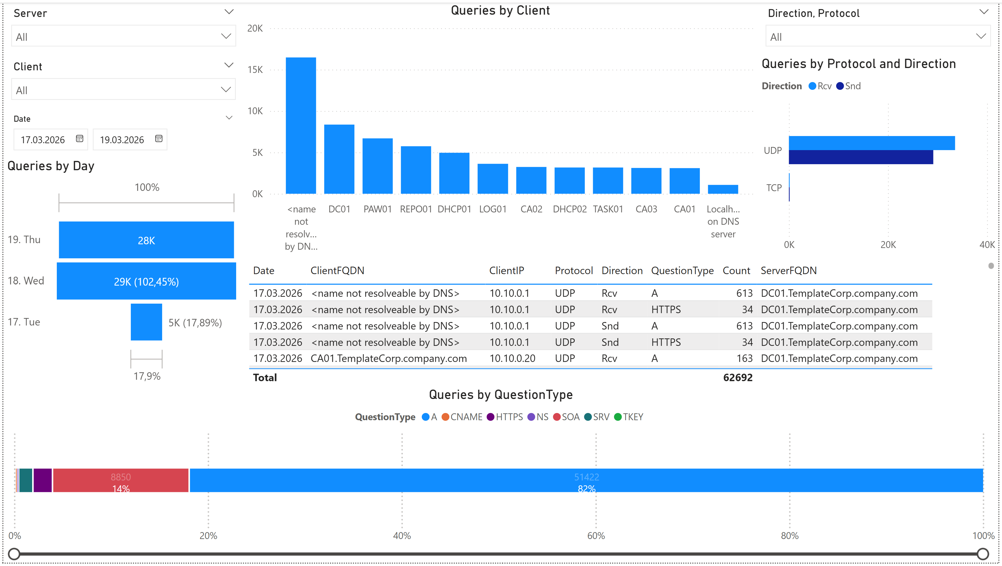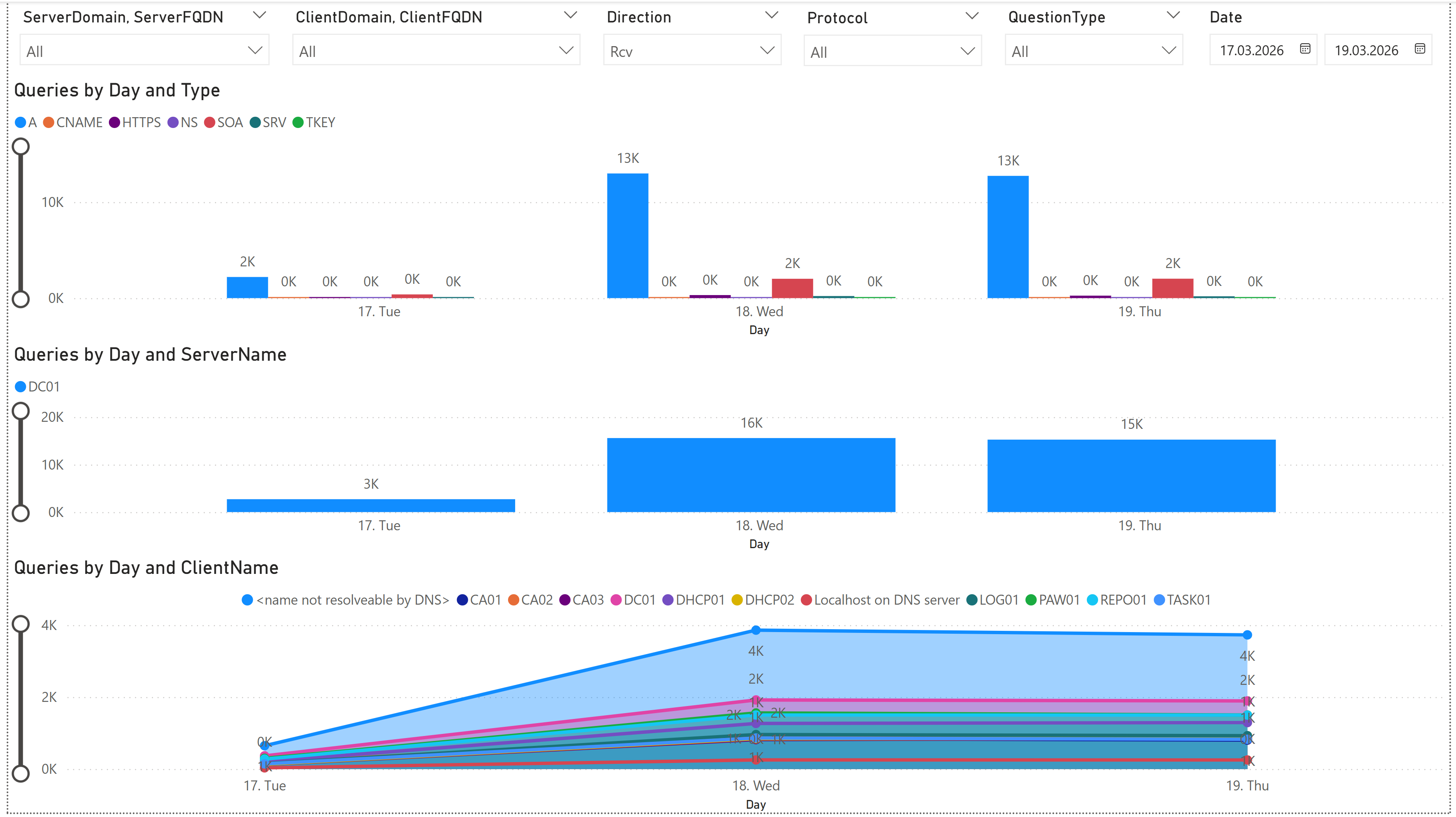 In case you have a segmentation of your network in place and you have access to the firewall logs, you can get information about who is communicating for DNS -and all the other services- from there. This is not the most detailed information, because it lacks granularity and the service-specific details, but it can be helpful and a quick win if it is already in place. This may not be an option if you have flattened networks, there is probably no firewall between the DNS-Clients and the DNS-Server. You can use the local Windows-Firewall anyway, but as you may see in the next sections, there are better options in that case. Then there is unfortunately the prohibiting case of “organizational silos” and “lack of communication” between teams, where it simply may not be feasible to get the firewall logs, even if they exist.