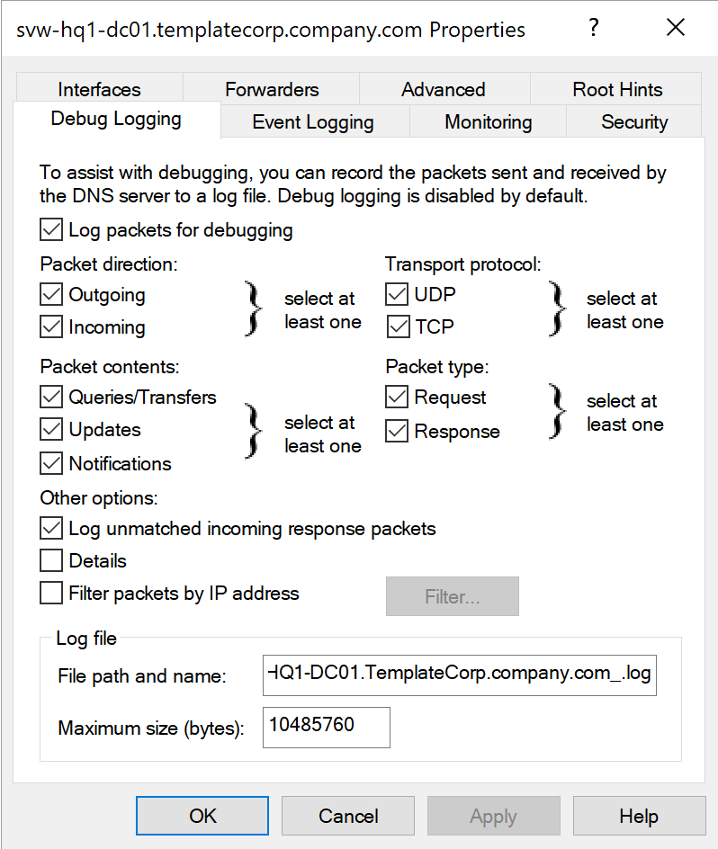 The Windows DNS Server also has a built-in text-based debug logging that can be configured easily. This feature allows you to log the same details as the “Analytical” Event Log, but it writes into text files and provides roll-over capabilities, so it can be used for a longer-term approach.