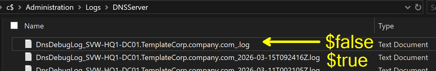 This example, especially with the filtering in the file selection process, is intended to run directly on the DNS servers. But it is also fine to run it on a dedicated machine to spare resources on the DNS servers. If it is running on a dedicated machine, you do not need to use Select-Object -Skip 1 in the file selection process.