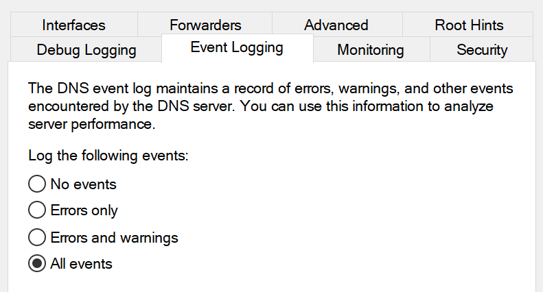 Hopefully you have the EventLog configuration to log All Events in place on your DNS Server. If not, now is the time to set it up, because it is a good starting point for operational logging in your Windows DNS service.